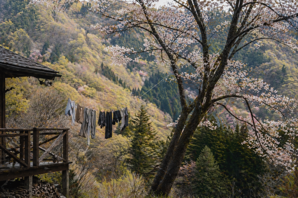 Around my cabin stand four yamazakura, each with its own presence. The closest has become my “laundry tree.” From the deck, a line stretches upward to a branch perhaps 10 meters high, rigged on a reel that lets me send clothes gliding out into the open air and draw them back again. It’s a small daily ritual, part convenience, part quiet pleasure.